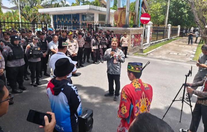 Aksi damai berlangsung pada dua lokasi, yang diawali di depan pintu keluar Kantor Gubernur Kalteng, Jalan G. Obos dan dilanjutkan ke Kantor Pengadilan Tinggi Palangka Raya, Jalan RTA Milono, Kota Palangka Raya, Kalimantan Tengah, Kamis (9/4/2026) siang.