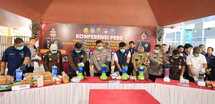 Total barang bukti yang berhasil disita antara lain sabu 7,9 kg, ganja 5,9 kg, ekstasi 5.551 butir, ketamin 47,3 kg, tramadol 145 ml, serta berbagai obat keras tanpa izin edar.