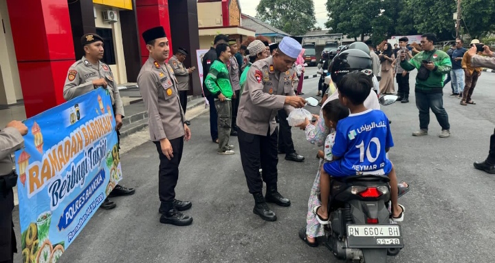Pembagian takjil gratis dilaksanakan di depan Mako Polres Bangka yang berada di Jalan Ahmad Yani, Sungailiat, Kabupaten Bangka.